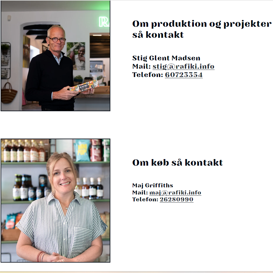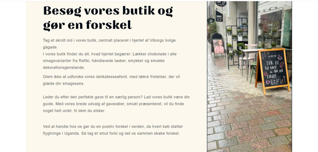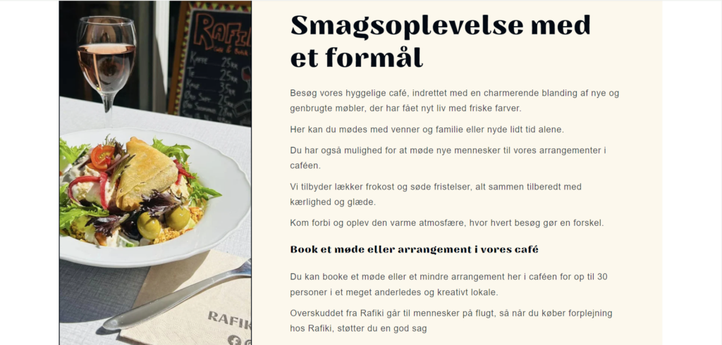 Jeg tilføjede en ny side til hjemmesiden, der handler om Rafikis nye butik-café. Tidligere var der ingen information om dette spændende tiltag, så den nye side indeholder detaljer om butikkens- caféens koncept, åbningstider, beliggenhed og hvad kunderne kan forvente at opleve der.